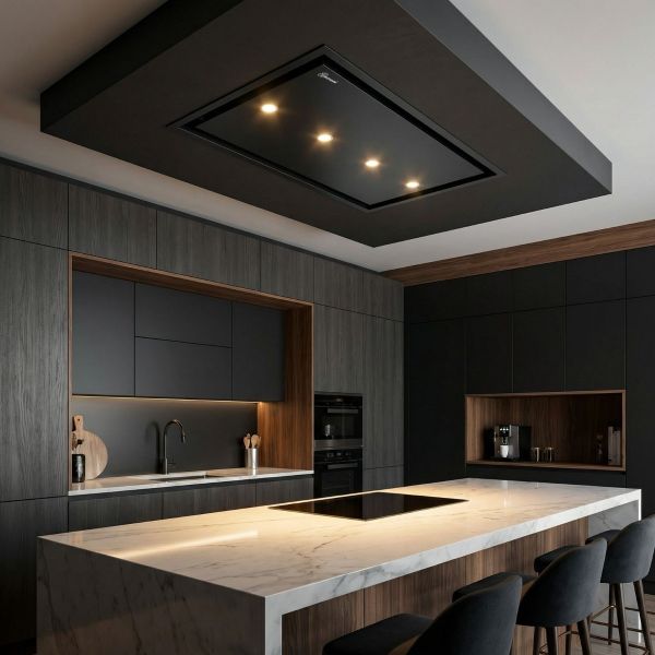 • Decken-Dunstabzugshaube in modernem Schwarz, flaches Design für bündige Deckenmontage