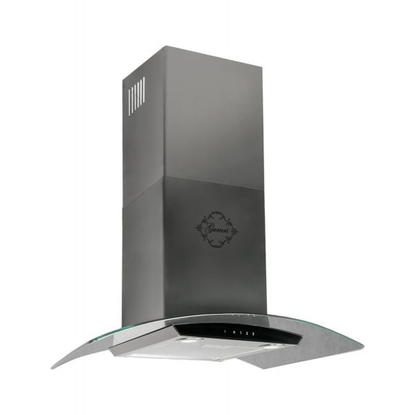 Das Modell GCH T 465 IS 60 BL Prime ist eine moderne Dunstabzugshaube mit Schwazglaspaneel. Korpus und Kamin sind aus Edelstahl.